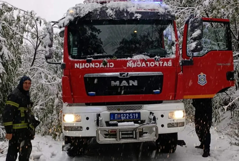 Pripadnici Uprave za vanredne situacije – vatrogasci spasioci i zaposleni u JKP-u se nalaze u Bajčetini i Dulenima gde uklanjaju drvece sa puta.